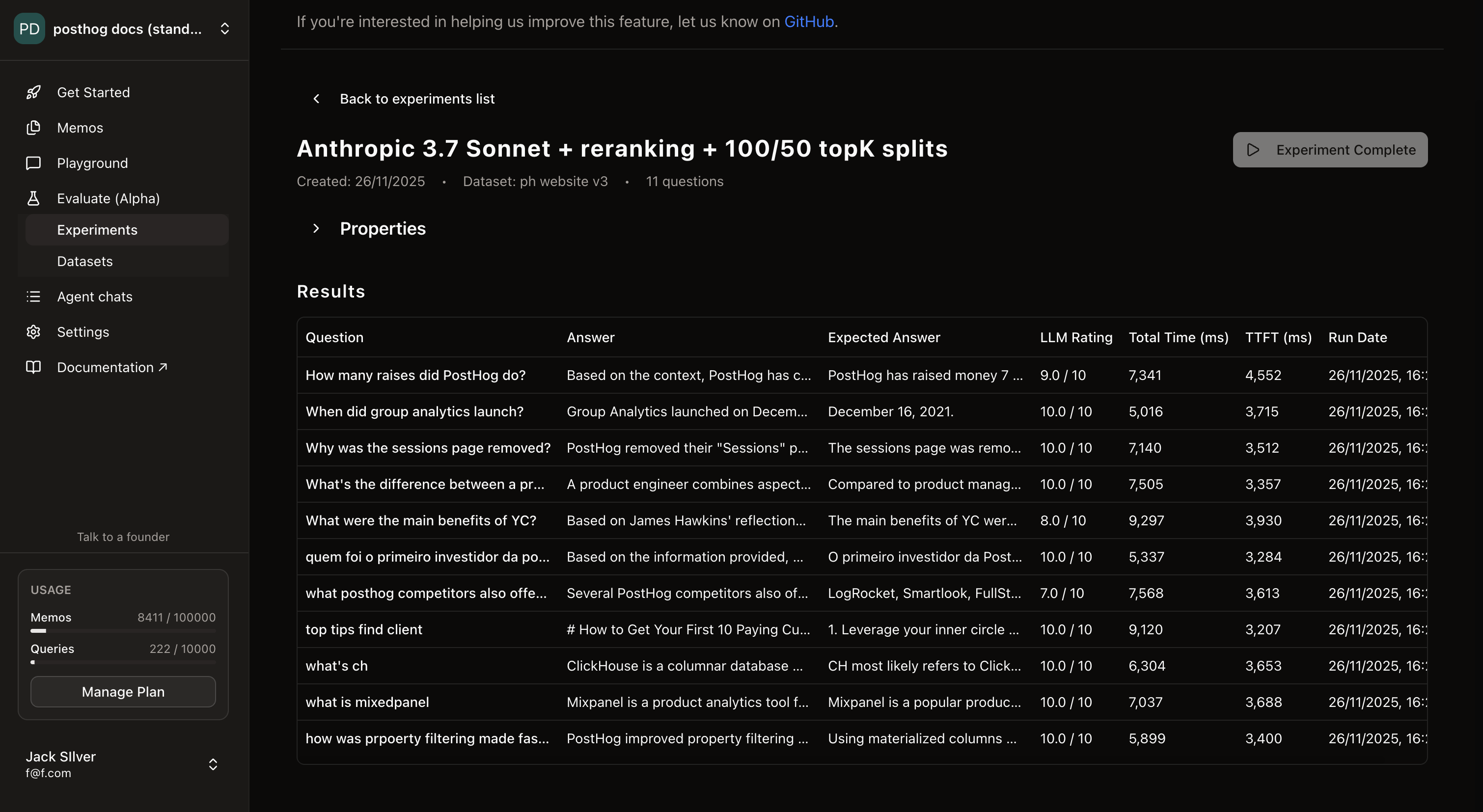 Having gotten this sorted, I imported all the content from the PostHog website [1] and set up a tiny dataset [2] of questions and expected answers inside of Skald, then used our Experiments feature to run the RAG over this dataset.
